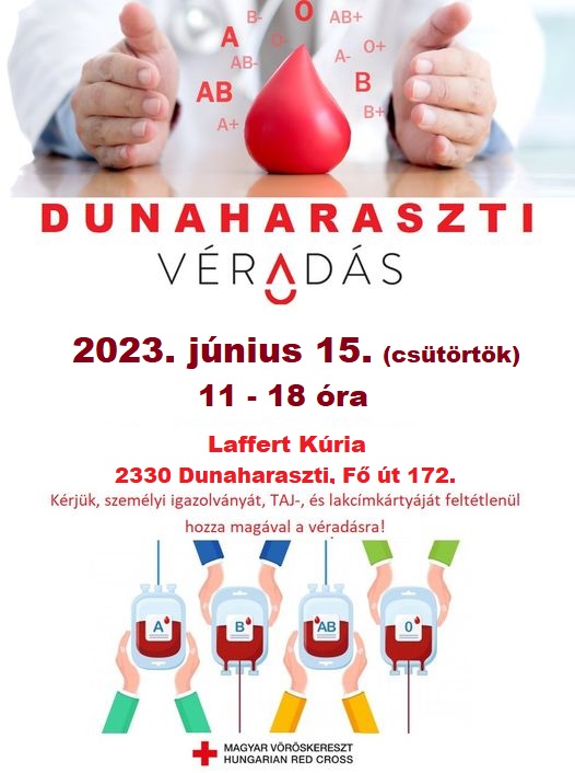 Dunaharasztin a Laffert Kúria ad majd otthont a következő véradásnak. A donoroktól azt kérik, hogy vigyék magukkal személyi igazolványukat, TAJ-, és lakcímkártyájukat.