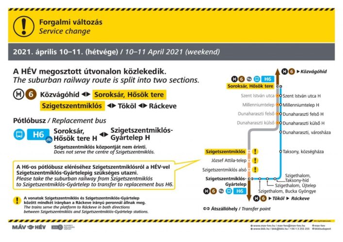 Karbantartás miatt 2021. április 10-én és 11-én (szombaton és vasárnap) a H6-os HÉV megosztott útvonalon, csak a Közvágóhíd és Soroksár, Hősök tere, illetve Szigetszentmiklós és Ráckeve között jár.