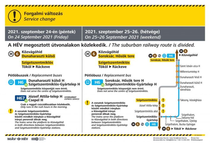 Szeptember 24-én a reggeli csúcsidőszakban a József Attila-telep és Csepel HÉV-állomás között is jár pótlóbusz, H67-es jelzéssel. Szeptember 24-én egyes délutáni, Szigetszentmiklóstól Ráckeve felé tartó vonatok utolsó három kocsija csak Tökölig közlekedik. Kérjük, figyelje a menetrendet és a hangos utastájékoztatást!