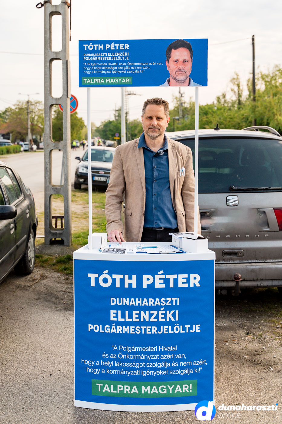 Tóth Péter magánszemély is szeretne polgármesterjelölt lenni, így ő is felállított egy standot. Érdekes egyébként, hogy ezen szerepel a Magyar Péter fémjelezte mozgalom jelmondata, bár szerkesztőségünk a politikus környezetéből úgy értesült, erre nem adtak engedélyt, és nem is támogatják Tóthot.