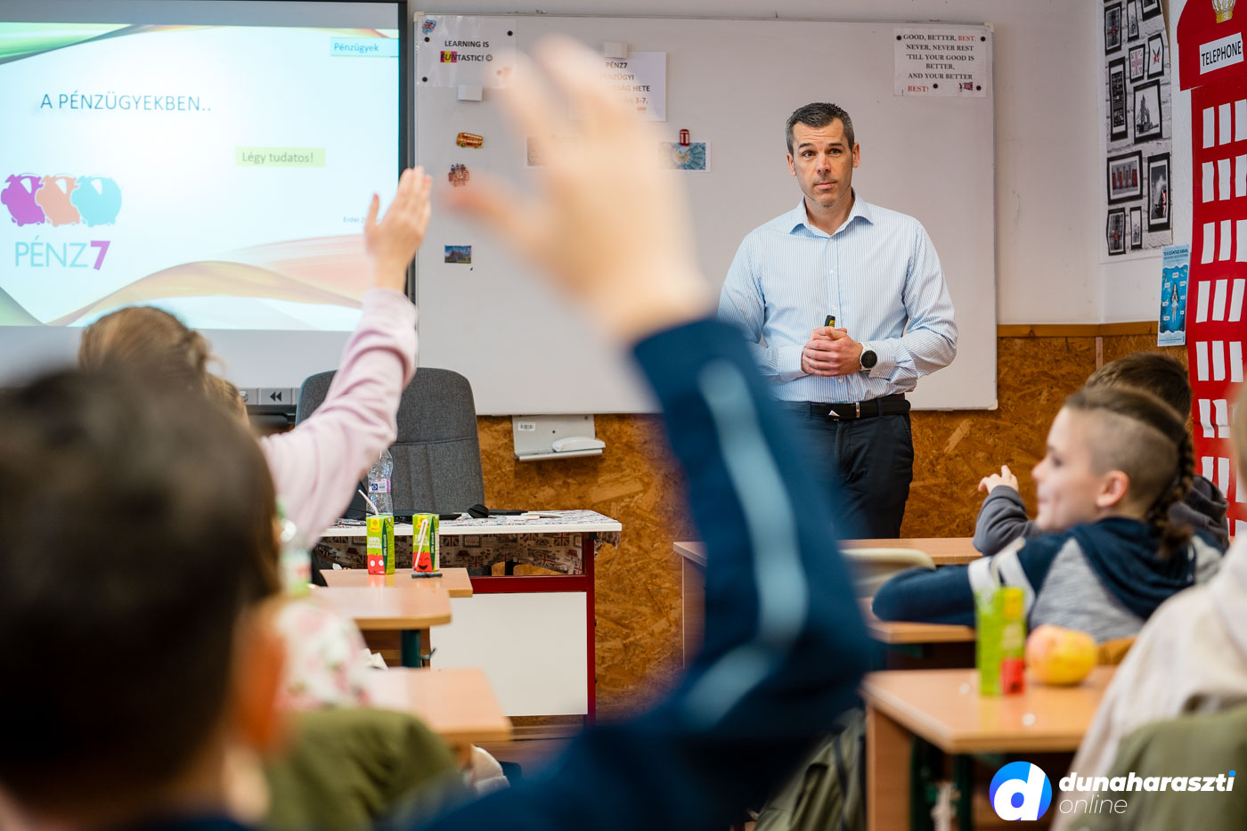 A projekthét keretében az osztályfőnöki és egyéb órák keretében élmény alapú formában adják át a tudást a gyerekeknek, amelynek segítségével megismerhetik a pénzügyi és gazdálkodási alapfogalmakat. Mi egy olyan órán jártunk, ahol Erdei Zoltán, bankszakember forgalkozott a gyerekekkel. Könnyen befogadható formában beszélt pénzügyi alapfogalmakról. Így szóba került a bevétel, a kiadás, a megtakarítások fontossága.