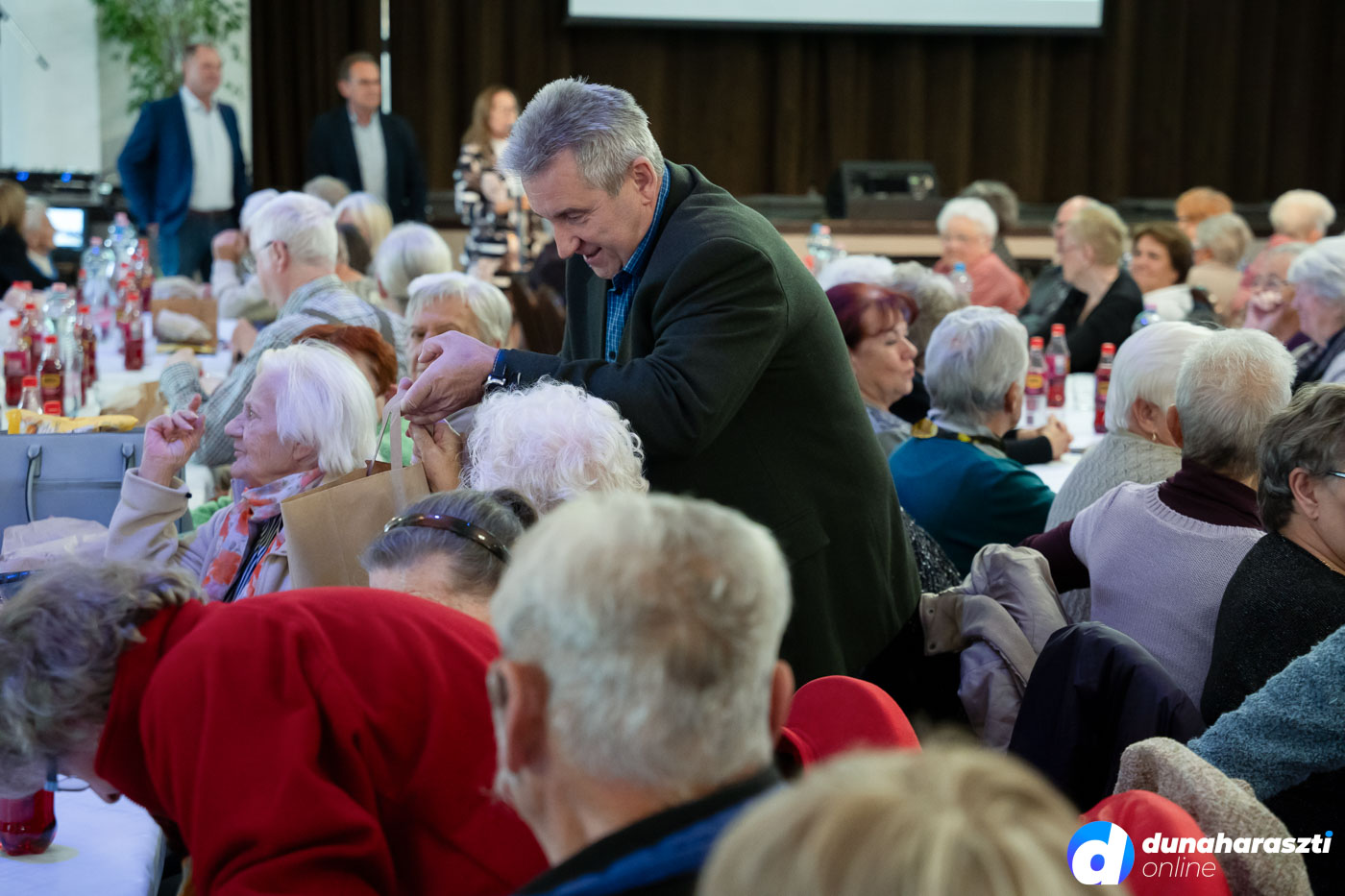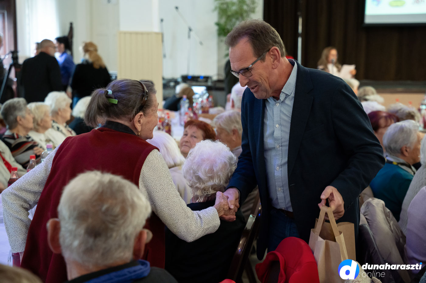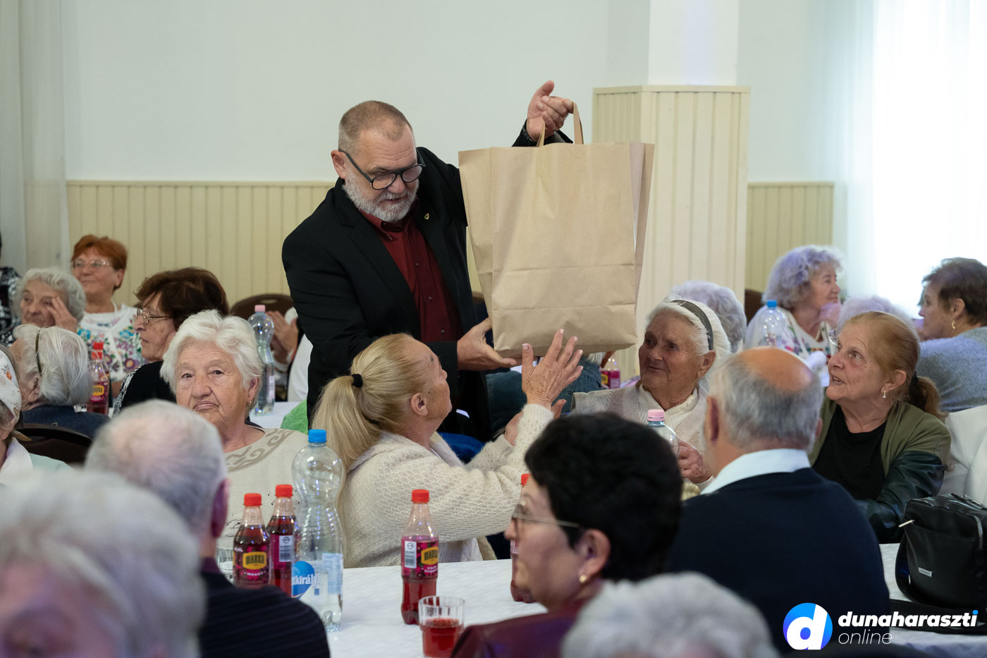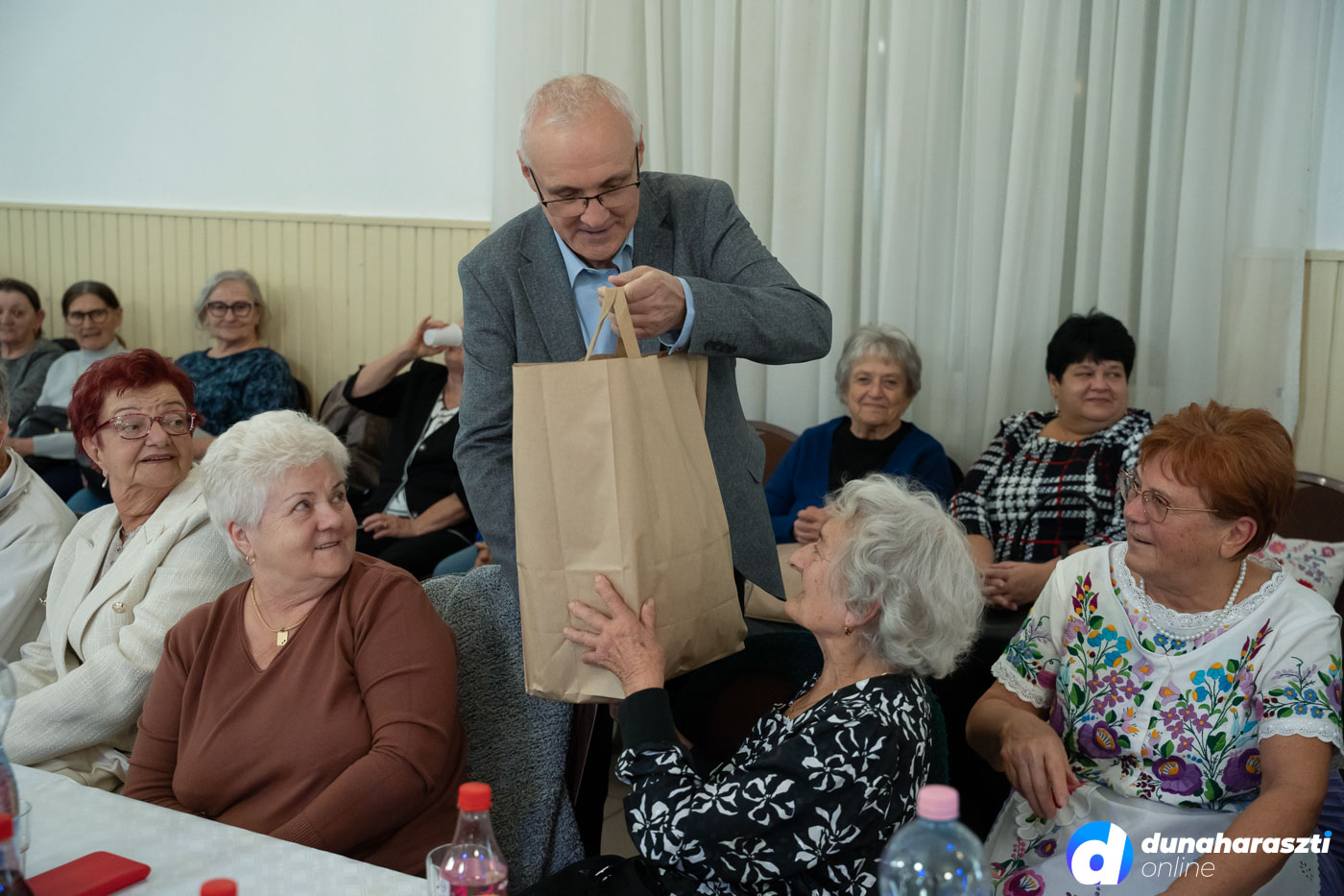 A József Attila Művelődési Házban vendégelte meg a város az időseket, akiket először Galó Anita intézményvezető, majd Dr. Szalay László polgármester köszöntött. Az 50 legidősebb haraszti lakos ajándékcsomagot kapott, köztük Váczi Andrásné Lacza Teréziát, aki éppen ma (2025.10.02.) ünnepli a 100. születésnapját. A csomagokat a képviselő-testület jelen lévő tagjai, Karl József, Kücsön Sándor, Láng Norbert, Lehel Endre, és Vojtehovszki Beáta adták át.