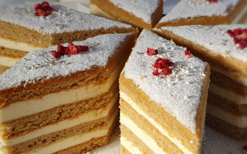 Nincs más hátra, mint összeállítani. A krémet 3 részre osztjuk és betöltjük vele a lapokat, a tetejét megszórjuk porcukorral és puhulásig hűtőbe tesszük.