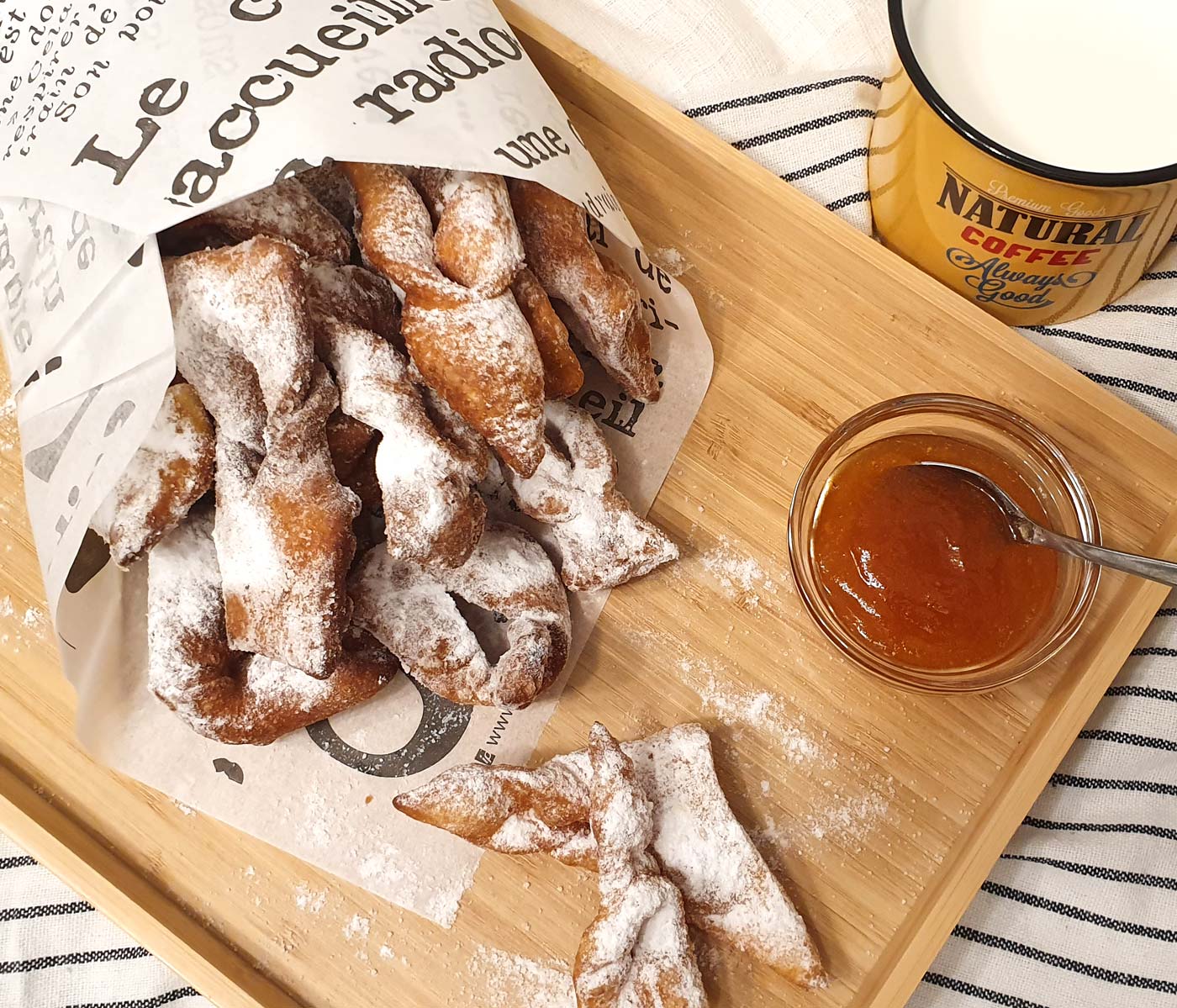 Ez után nagyjából 3-4 mm vékonyra nyújtjuk, rombusz alakú darabokat vágunk belőle. Ezek közepére kis bevágást ejtünk, amin a rombusz egyik csúcsát átbújtatjuk. Meleg, de nem forró olajban oldalanként 1 perc alatt megsütjük. Még melegen porcukorral vagy fahéjas porcukorral megszórjuk és baracklekvárral tálaljuk.