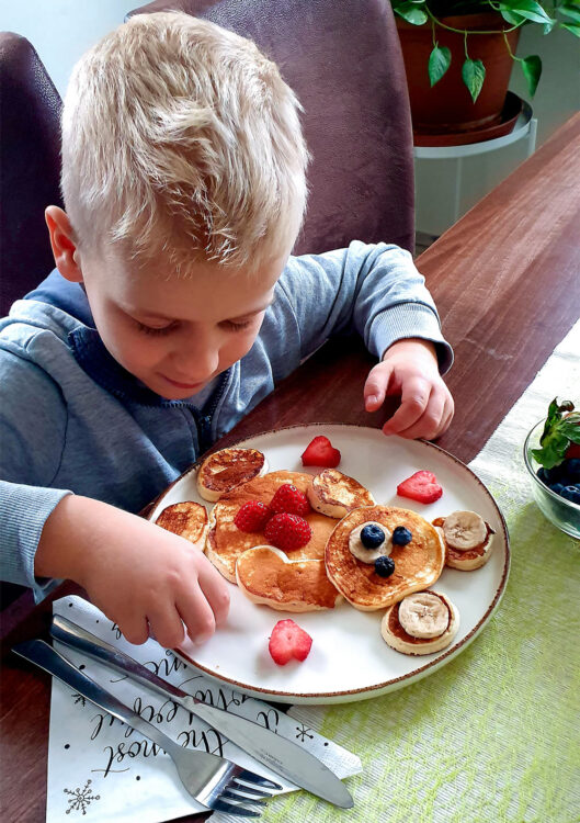 Juharsziruppal, csoki szósszal, friss gyümölccsel vagy bármilyen gyümölcslekvárral tálaljuk. Domi jó sok juharszirupot szokott kérni, rengeteg gyümölccsel! Akinek pedig van kedve, formázhatja a sütőben a palacsintát, ahogy én tettem. Nem nagy ördöngösség.