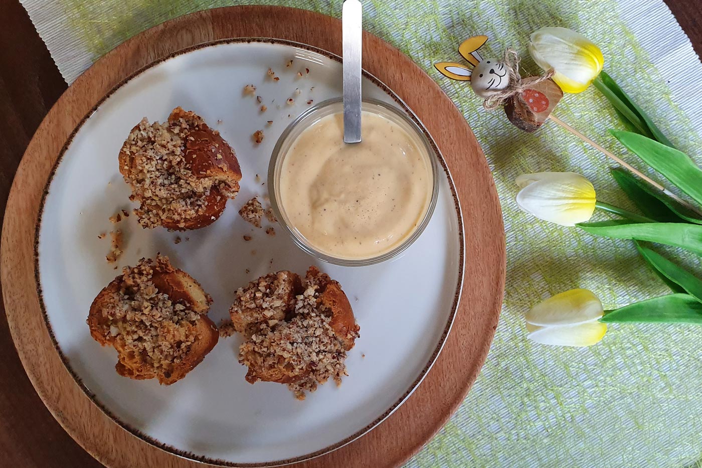 A muffin formát szilikonos ecset segítségével az olvasztott vajjal kikenjünk, a kalács kockákat belemártjuk az olvasztott vajba, majd rögtön a mogyorós keverékbe és belepakoljuk a muffin formákba, 3-4 kocka megy egy-egy lyukba. Ha tele pakoltuk az összeset, 170° C-os előmelegített sütőben kb. 20 perc alatt aranybarnára sütjük. Addig van idő elkészíteni a sodót. Na ez sem lesz nehéz: az összes hozzávalót egy edénybe mérjük, csomómentesre keverjük és folyamatos keverés mellett közepes lángon puding állagúvá főzzük.