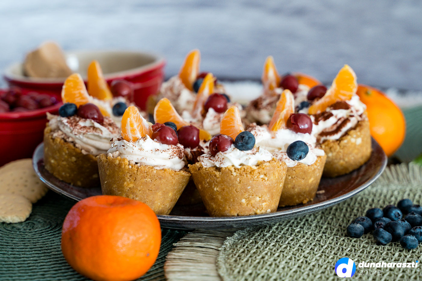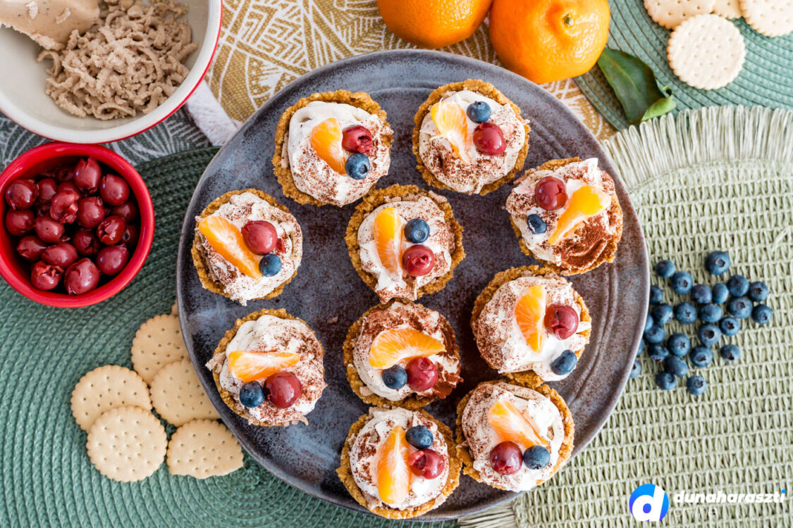 A krémünk nagyjából fele fogyott el, így a maradékot egy tiszta nejlonzacskóba töltjük, levágjuk az egyik sarkát, és ennek segítségével a kosárkák tetejére nyomjuk. Végül megsüvegeljük egy kis tejszínhabbal, megszórjuk kakaóporral, majd gyümölcsökkel díszítjük.